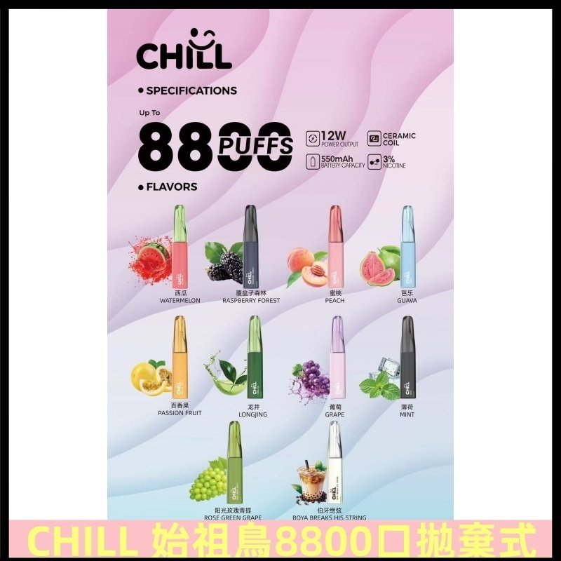 CHILL 8800口拋棄式電子煙共推出十多款人氣口味,能滿足不同偏好。